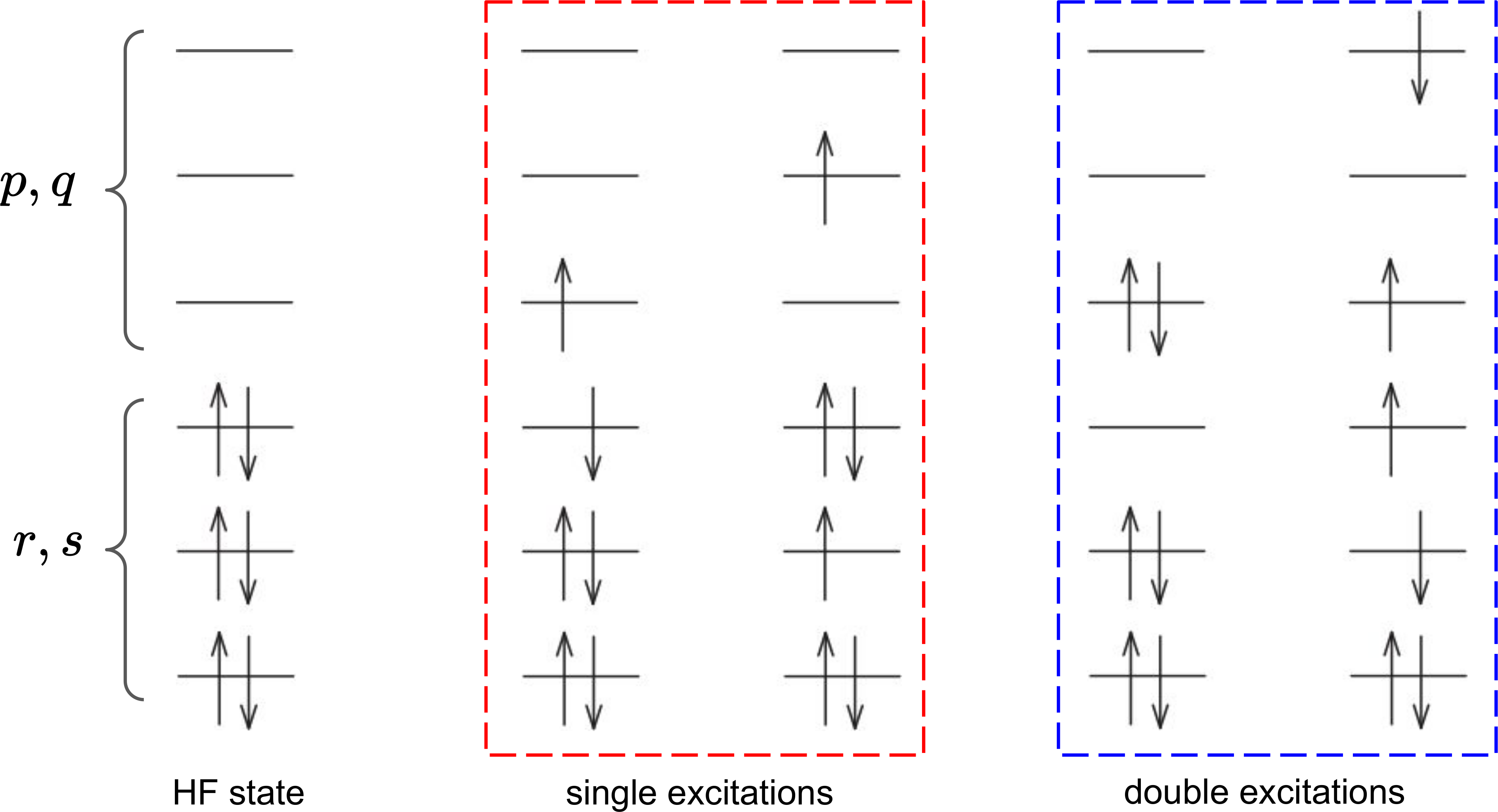 \[\begin{split}&& \hat{T}_1 = \sum_{r \in \mathrm{occ} \\ p \in \mathrm{unocc}} \hat{c}_p^{\dagger} \hat{c}_r \\ && \hat{T}_2 = \sum_{r>s \in \mathrm{occ} \\ p>q \in \mathrm{unocc}} \hat{c}_p^{\dagger} \hat{c}_q^{\dagger} \hat{c}_r \hat{c}_s.\end{split}\]In the equations above the indices \(r, s\) and \(p, q\) run over the occupied (occ) and unoccupied (unocc) spin orbitals and \(\hat{c}\) and \(\hat{c}^{\dagger}\) are the electron annihilation and creation operators, respectively.